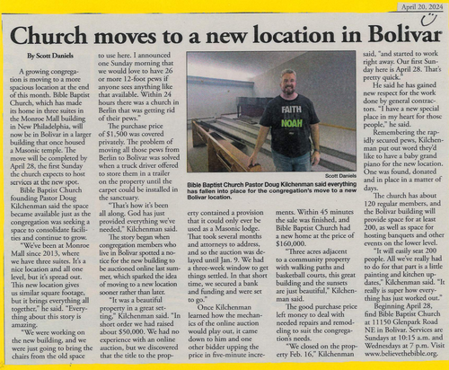 Bible Baptist Church was planted in Tuscarawas County, Ohio in September of 2013 (with 23 adults and 18 children and youth) as an independent Baptist church by the First Baptist Church of Jackson with a mission to glorify God, make disciples and reach the whole world for Jesus Christ!